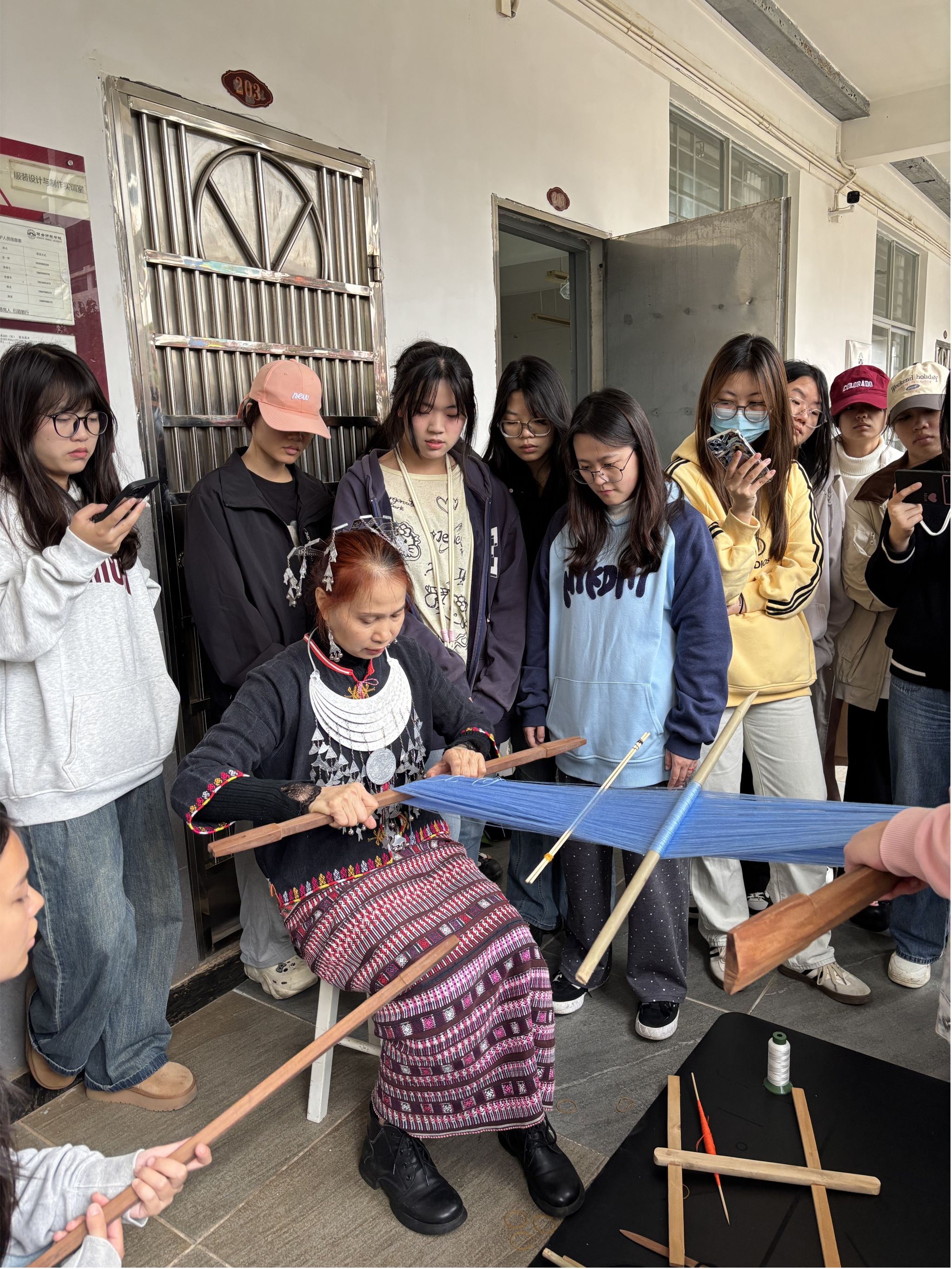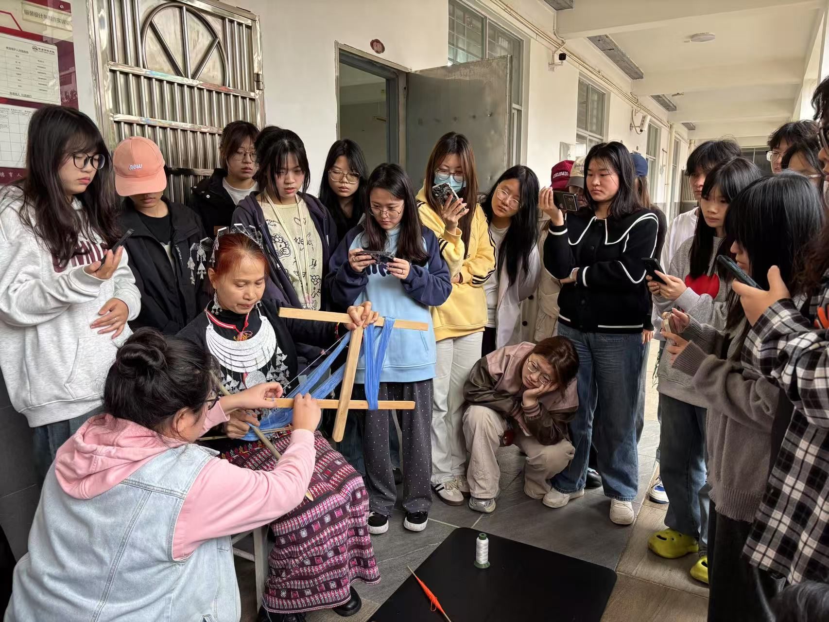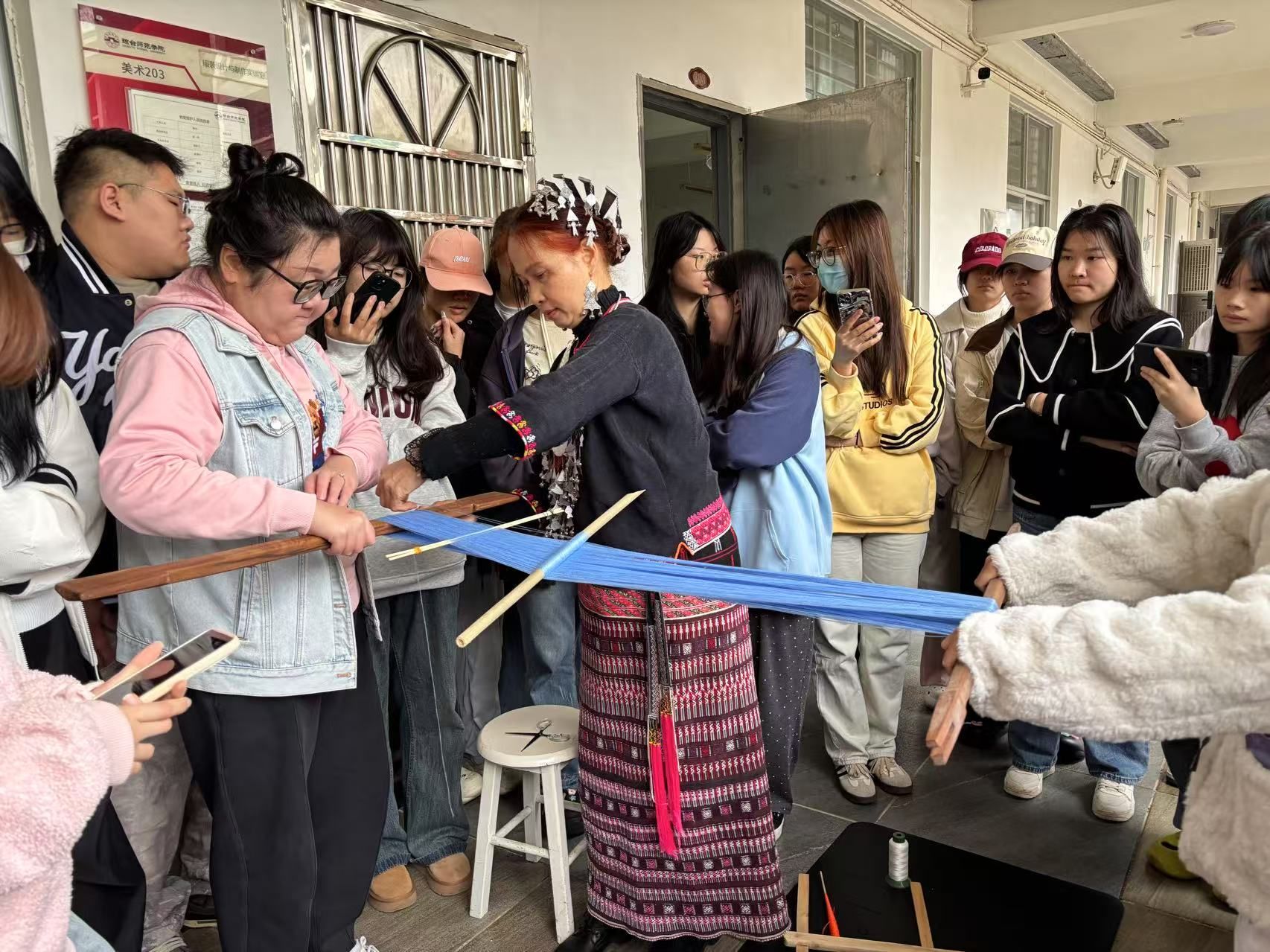 活动当天,海南省黎族纺染织绣技艺传承人陈丹老师,以其深厚的功底和精湛的手艺,向大家展示了绕线、下架、上织机、挑滑线、织布、挑花等一系列黎族织锦技艺。现场师生们被陈丹老师的技艺深深吸引,仔细观摩,认真聆听。陈丹老师不仅耐心地讲解着每一个步骤的要领和技巧,还不时地与师生们互动交流,解答他们的疑问。在她的指导下,师生们逐渐掌握了黎族织锦技艺的基本要领,纷纷动手尝试,亲身体验这一传统手工艺的魅力。