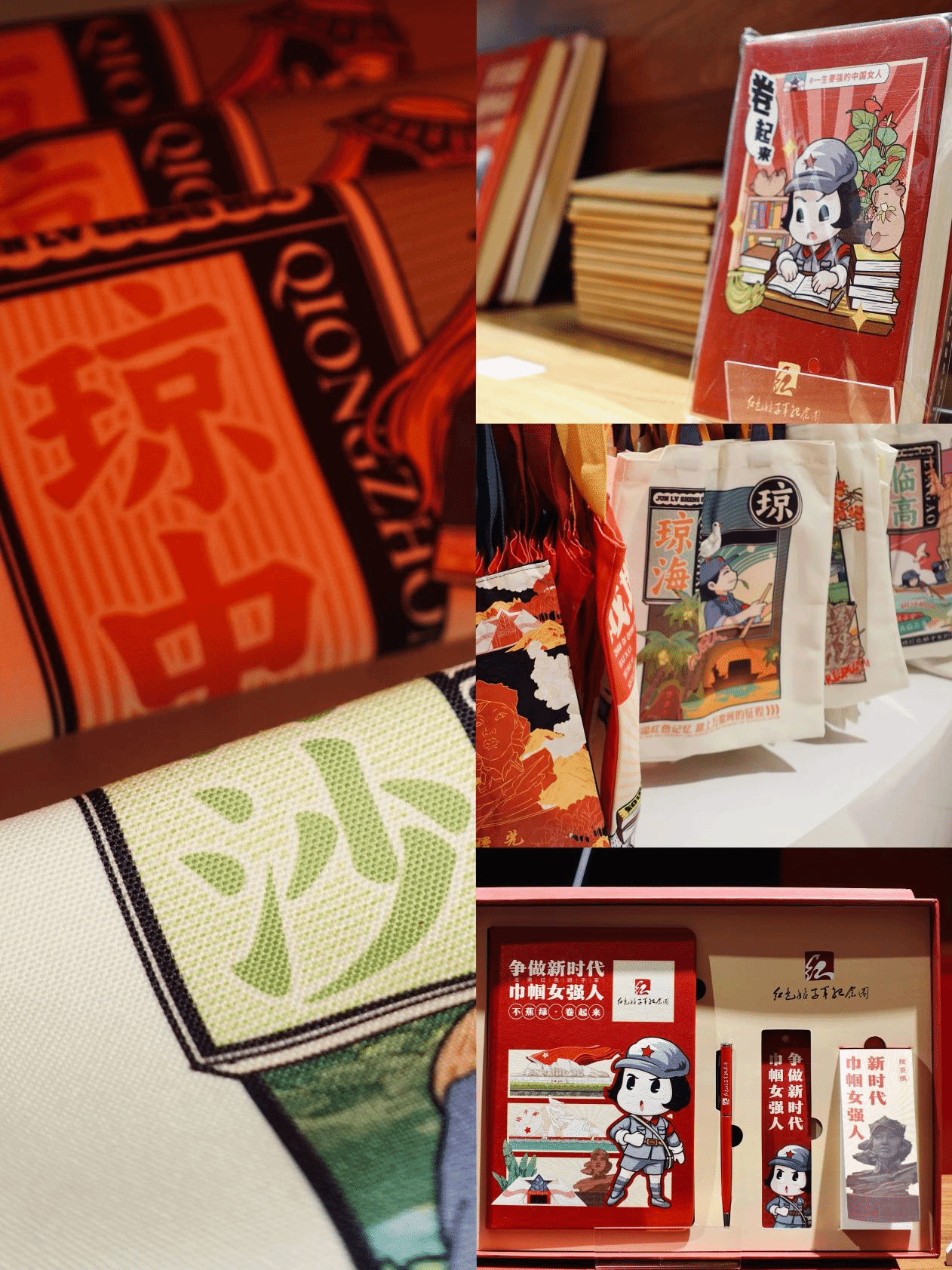 红色娘子军纪念馆文创区内,展示着各式各样以红色娘子军文化元素作为创作内核的文创产品,有冰箱贴、帆布袋、笔记本、水杯、明信片、T恤等等,产品创意新颖、寓意深刻,红色娘子军IP形象“琼花”栩栩如生。红色文创体现了当代年轻人对红色文化的高度认同和对民族历史的深切自豪感。