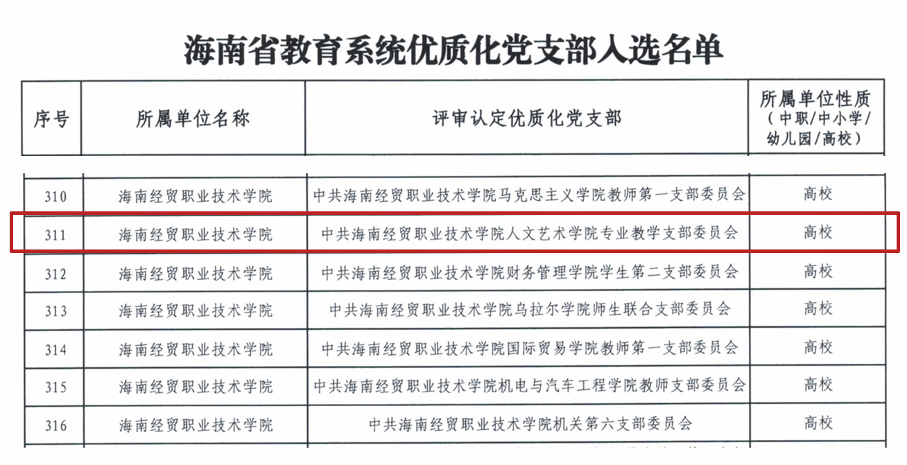 近日,中共海南省委教育工作委员会正式公布了全省教育系统优质化党支部入选名单,beats365亚洲版官网收获佳绩,共有7个党支部成功入选,其中beats365亚洲版官网专业教学党支部榜上有名,此外还包括beats365亚洲版官网教师第一党支部、公司员工第二党支部、乌拉尔公司师生联合党支部、国际贸易公司教师第一党支部、beats365亚洲版官网教师党支部以及机关第六党支部。