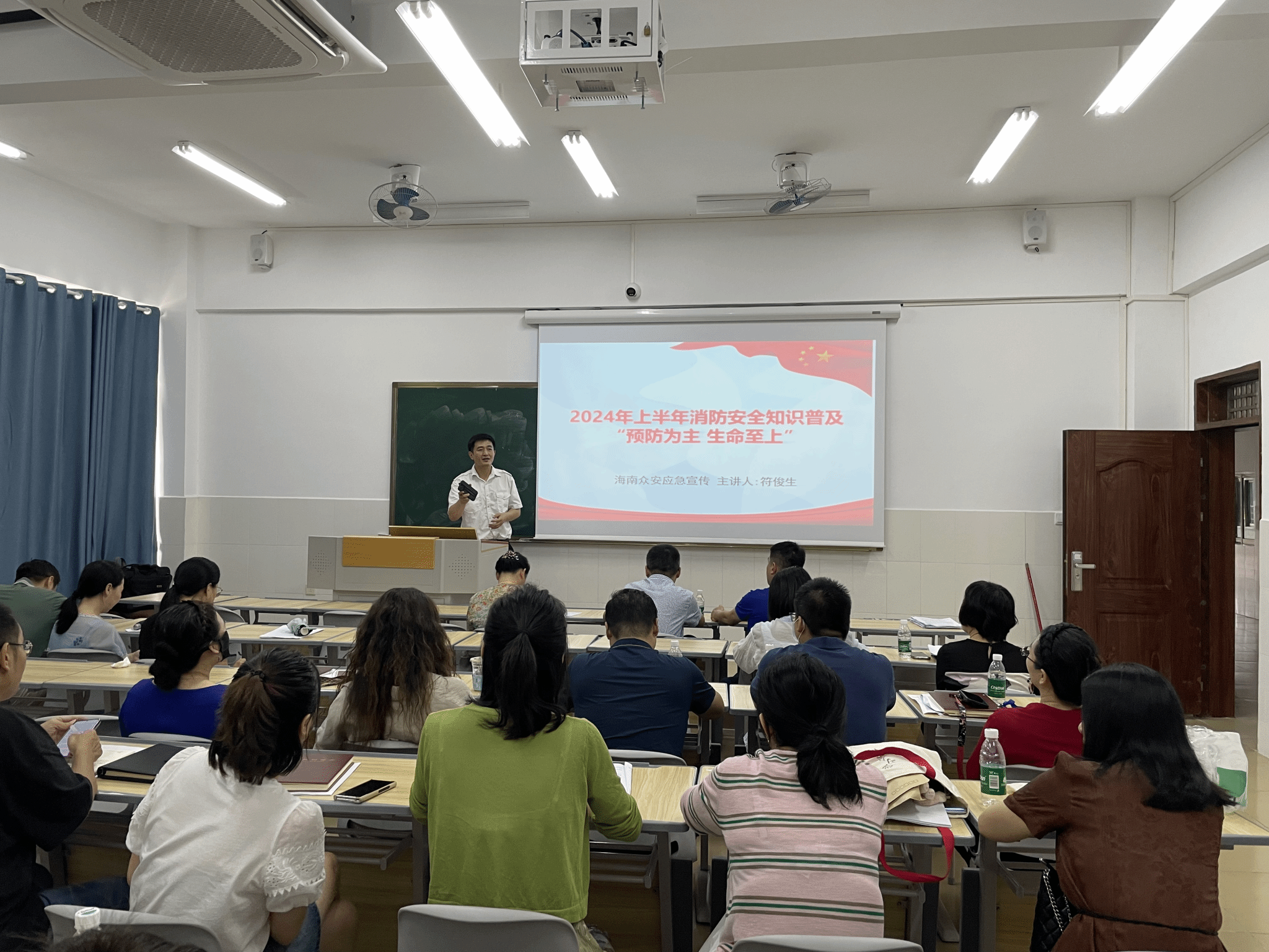 应急宣传教员符俊生受邀对教职工们进行消防知识培训。讲解了灭火毯、干粉灭火器、防毒面具的使用及操作方法,用多媒体视频和图文的形式向大家介绍了常见的家庭起火、交通工具起火、宿舍起火的原因及造成的危害,并结合海南省近期发生的火灾案例,对师生进行警示教育。