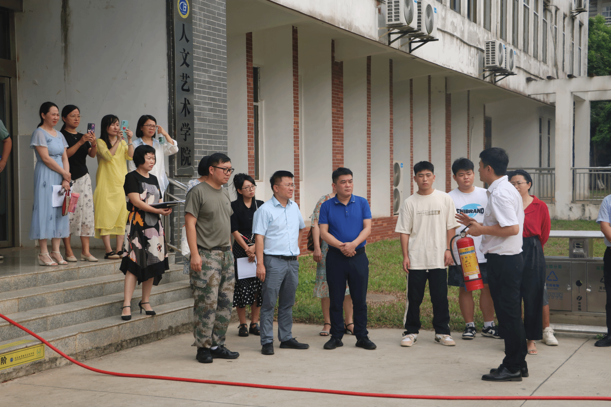 教职工认真倾听讲解员的消防知识培训,围绕校园、宿舍、办公区域防火灭火要点展开讨论,实际操作各种消防器材的使用,并在第六教学楼实地开展了灭火和应急疏散演练。