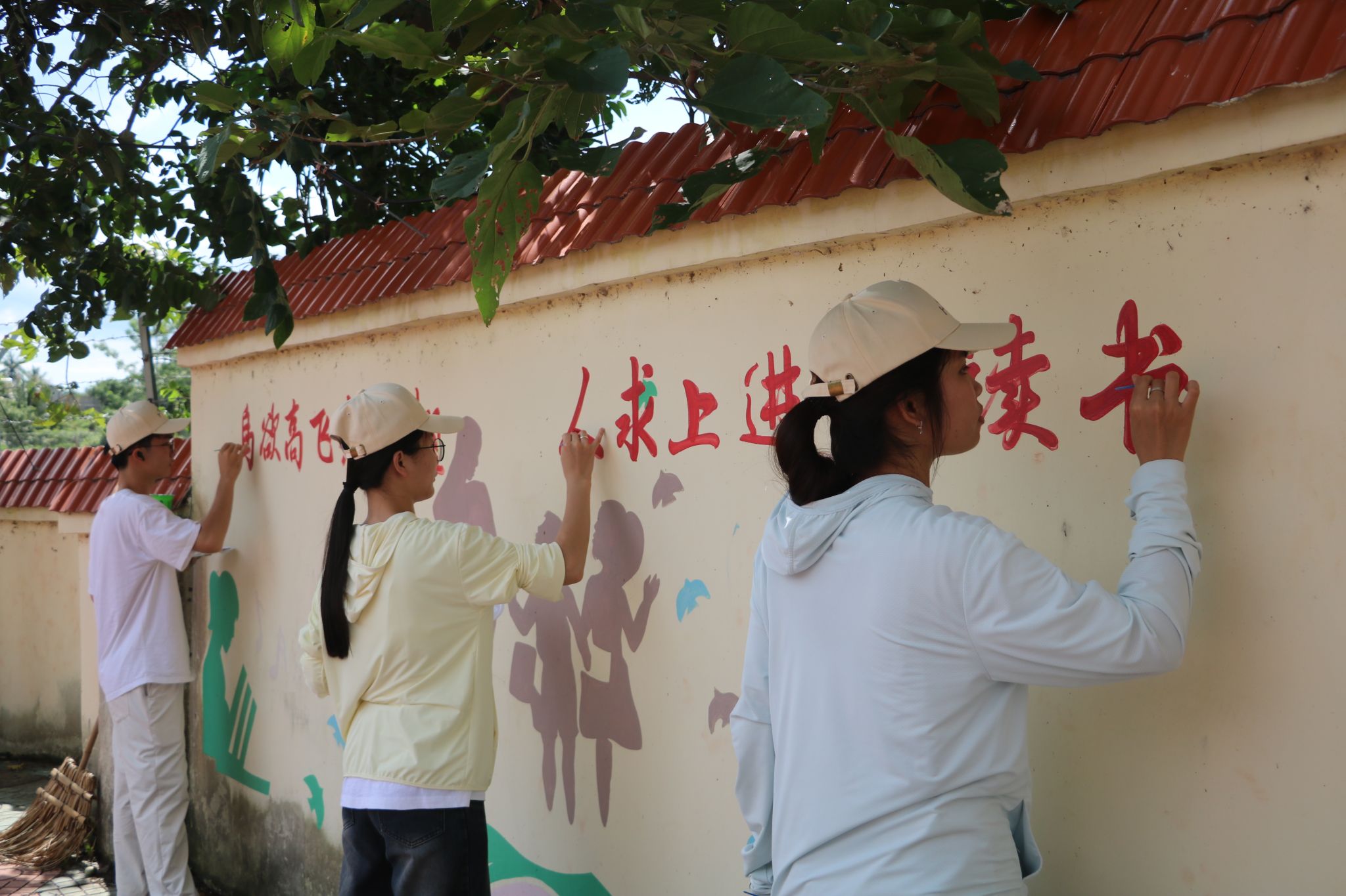 成员们依据墙绘的主题和风格,现场快速制定出详细的填色方案,力求在保留原有韵味的基础上提高色彩的饱和度、明度和亮度。在填色的过程中,成员们顶着炎炎烈日,认真负责、团结协作,不仅让专业技能得到锻炼,也为石碌镇水头小学的校园精神文明建设增添活力,还为当地和美乡村建设工作贡献了绵薄之力。