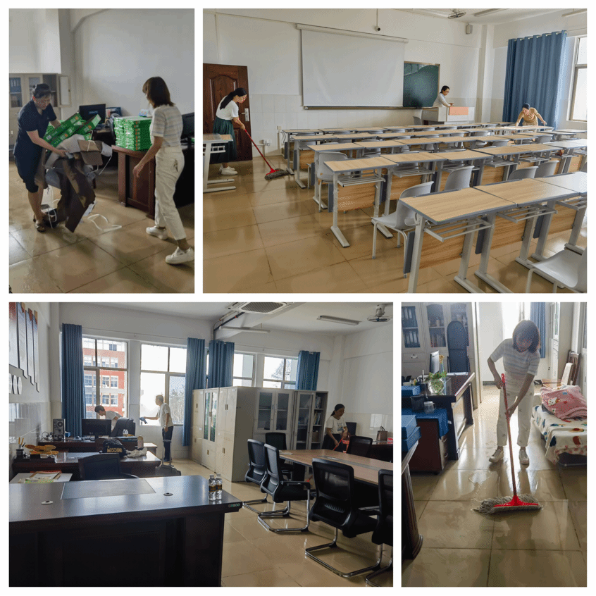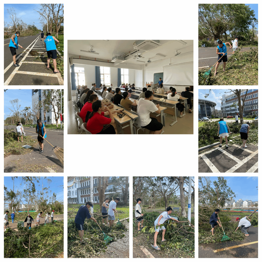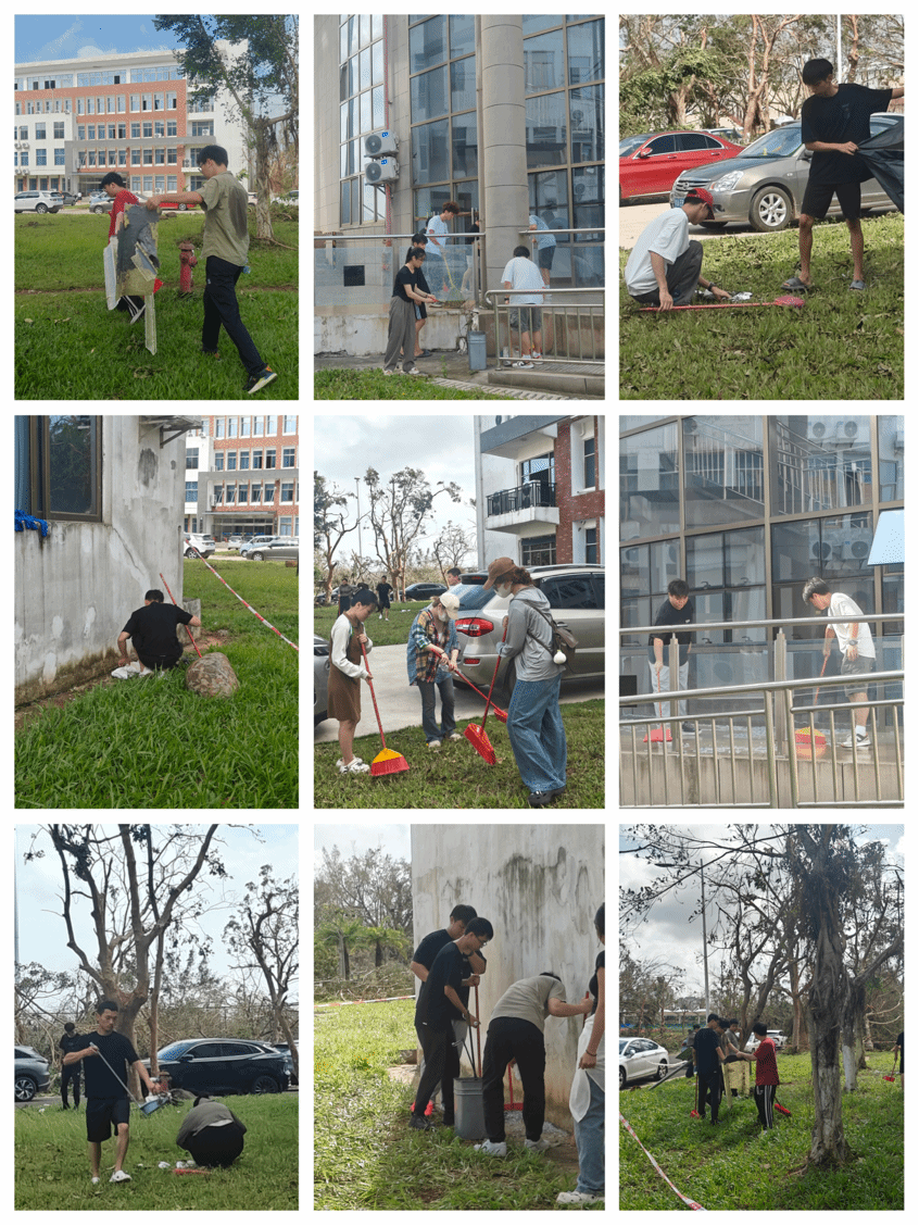 风雨无情,校园有爱,大家团结协作,众志成城,发扬不怕苦、不怕脏的精神,对第六教学楼责任区域和经贸北路全面清扫伏倒树木、路面积水、残枝败叶、玻璃碎片等垃圾。