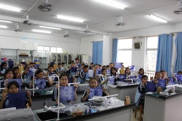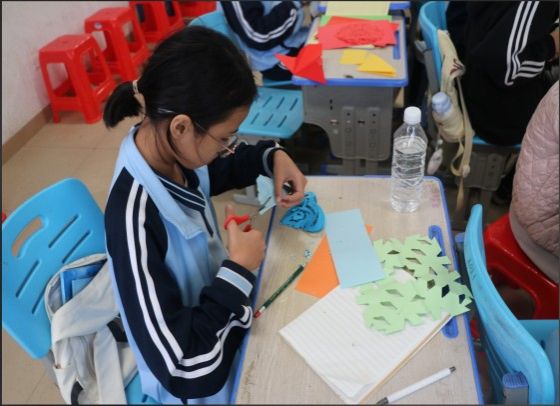 活动中,志愿者们为桂林洋中学的同学们带来了一场别开生面的非遗文化盛宴。志愿者们通过生动的讲解、精彩的演示和互动体验环节,向同学们介绍了剪纸、花灯和扎染三项传统非遗技艺的历史渊源、艺术特色与制作技巧。剪纸教室里,同学们被精美的剪纸作品深深吸引,在志愿者的耐心指导下,纷纷拿起剪刀和彩纸,亲手尝试剪出自己喜爱的图案;花灯描绘教室中,同学们接过形状不同的纸糊花灯,在志愿者的传授下巧妙地绘制出龙凤、花鸟等各种图案,灯一亮,惊艳了四座;扎染体验室内则充满了创意与惊喜,同学们发挥想象力,将白色的布料染成了色彩斑斓、独一无二的艺术品。