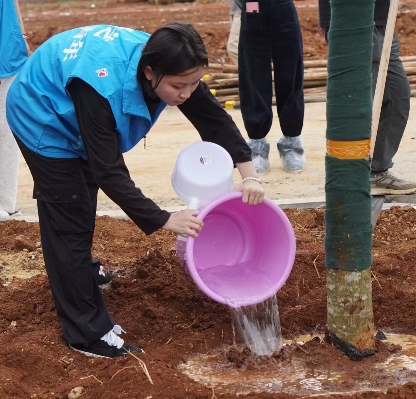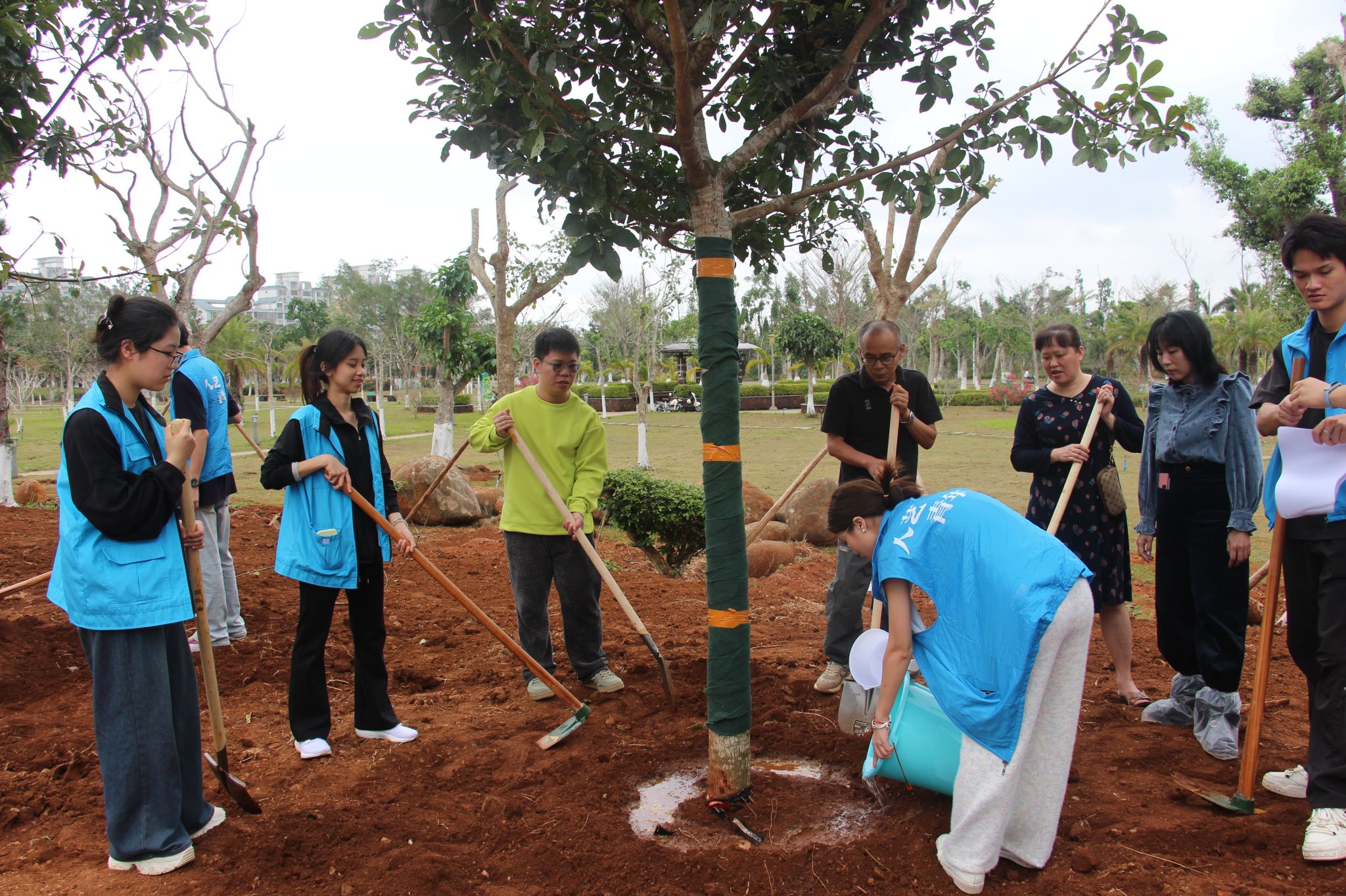 活动现场,师生们热情高涨,分工明确,干劲十足。有的挥锹铲土,有的扶苗填坑,有的提水浇灌,每一个环节都衔接有序,配合默契。“先把树苗扶正,再填土,一定要踩实咯!”“水多浇点,让小树苗喝饱!” 大家一边劳动,一边交流着植树的技巧和心得,植树现场温馨和洽,其乐融融。