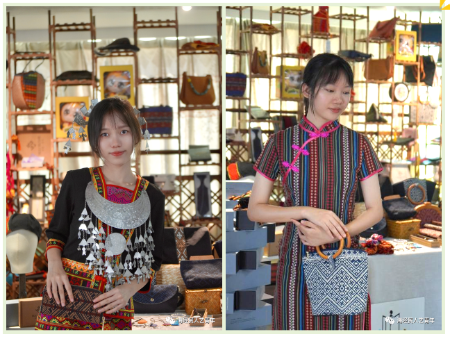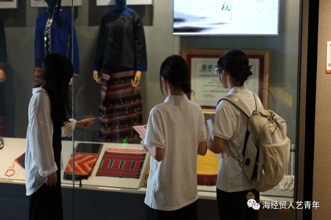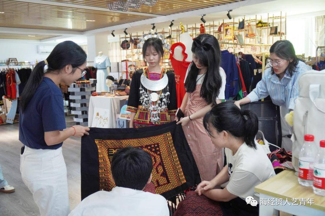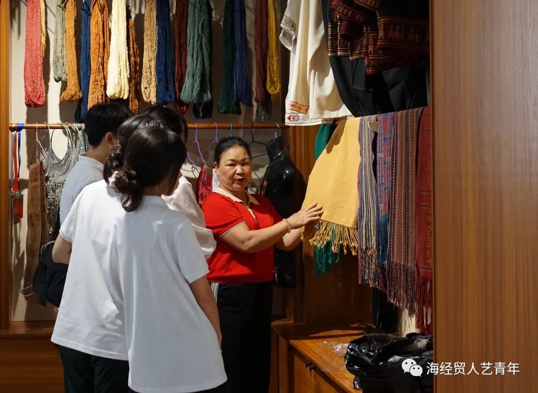 工作人员向团队成员介绍当前结合黎锦纹饰设计的文创应用及市场反馈情况,分享了创业心路历程。双方交流了传统元素设计应用中的经验,团队成员们还试穿了黎族特色传统服饰,并在社交平台协助推广传统文化。
