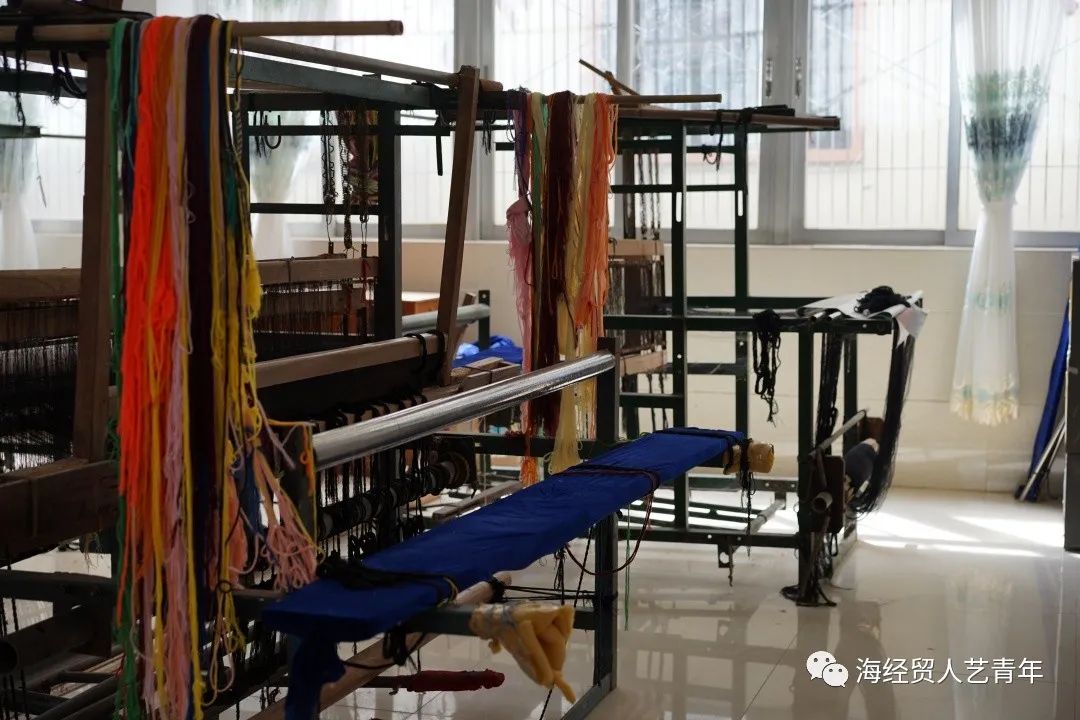 在黎族织锦传习所,刘老师利用精巧的腰肢机、落地织机,在配色及纹样等方面不断挖掘创新,使黎锦的画幅可以突破限制,织出更具新意的作品。刘老师向团队成员介绍,她们会定期深入村庄,教导村里的妇女利用空闲时间学习织锦,并负责收购,补贴家庭收入。如此一来,一代代手工艺匠人以娴熟的技艺织就出各式纹样精美的黎族织锦。在传承黎锦这项传统技艺的同时,切实帮助村民致富,实现美好生活,助力乡村振兴。