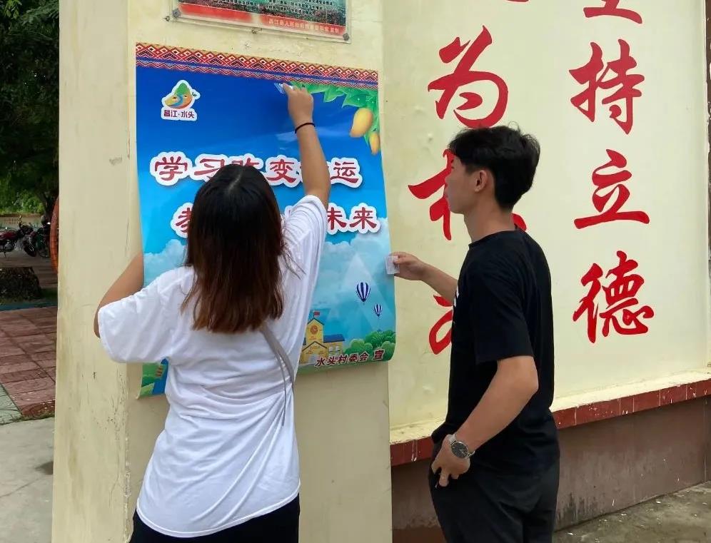 2020年8月12日,beats365亚洲版官网脱贫攻坚战青年宣传员实践团队来到本次活动的第二站也是最后一站——昌江黎族自治县石碌镇水头村,深入少数民族自治县脱贫工作队伍,了解其少数民族脱贫工作的内容,协助做好村内文明标语宣传,发挥专业特长助力打赢脱贫攻坚战。