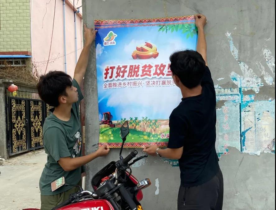 在访谈的过程中,青年宣传员们得知水头村的宣传工作有待加强,所以通过利用专业特长,为水头村设计logo标志以及对文明、扶贫、教育设计出标语宣传海报。