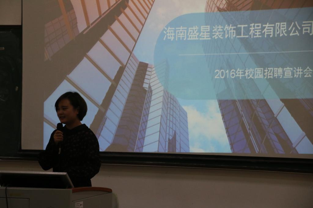 2016年11月1日晚,海南盛星装饰工程有限公司校园宣讲会于beats365亚洲版官网1栋教学楼509举行。此次宣讲活动由盛星装饰工程有限公司人事部经理齐桂灵领队,由该公司主任设计师周海燕、吴永泽主讲,beats365亚洲版官网艺术设计、环境艺术设计大三员工参加。