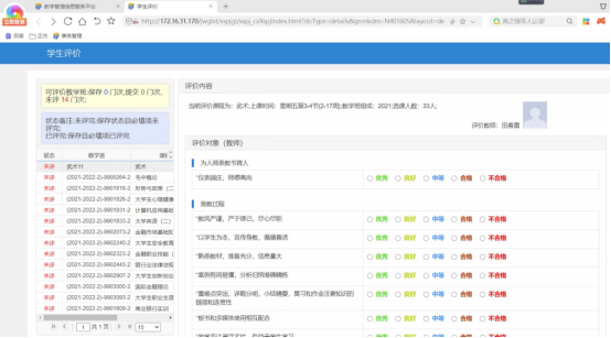 注意:进行教学评价时需要每评价一门课程保存一次,最后全评完了才能提交数据,一次必须全部评完,否则评价数据无效。