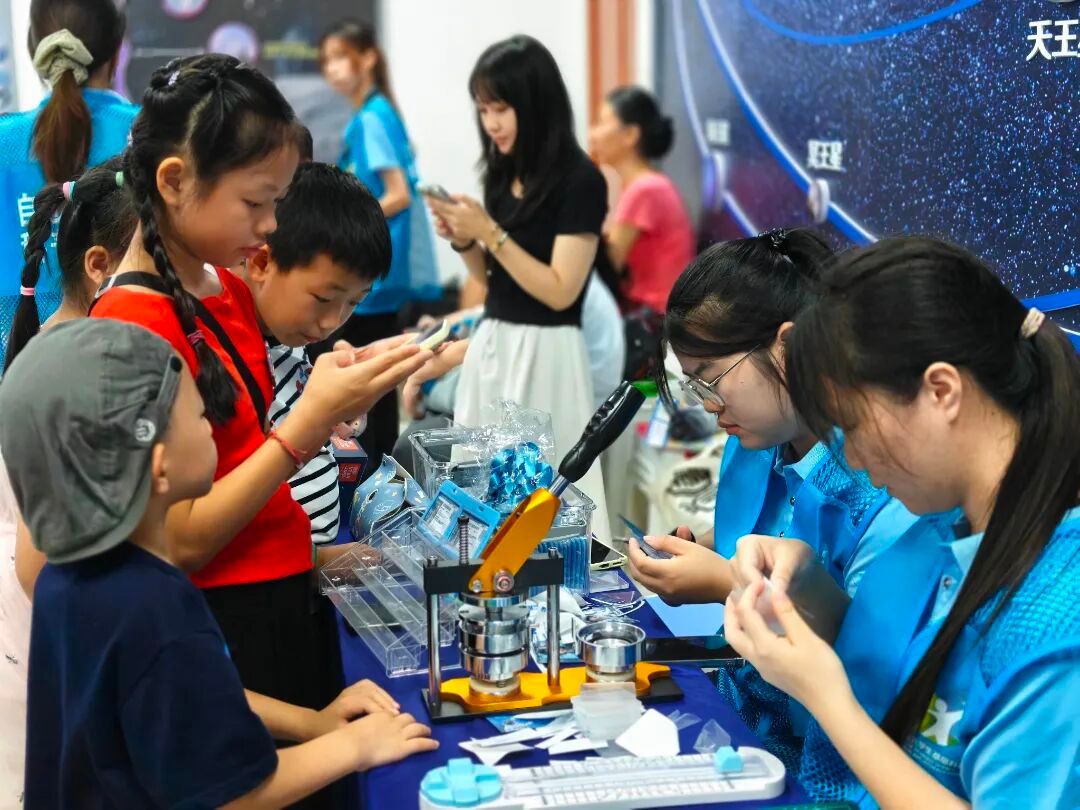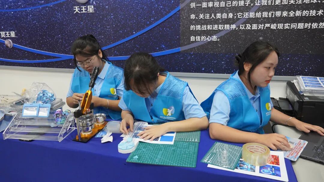 团队成员联合海口市科技馆开展航天职业体验活动,让孩子们了解商业航天的发展历程和航天器知识,参与职业思维倾向测试,生成AI融合航天职业画像,并制作成专属个人形象徽章、冰箱贴,让高端科技可知可感可留念。