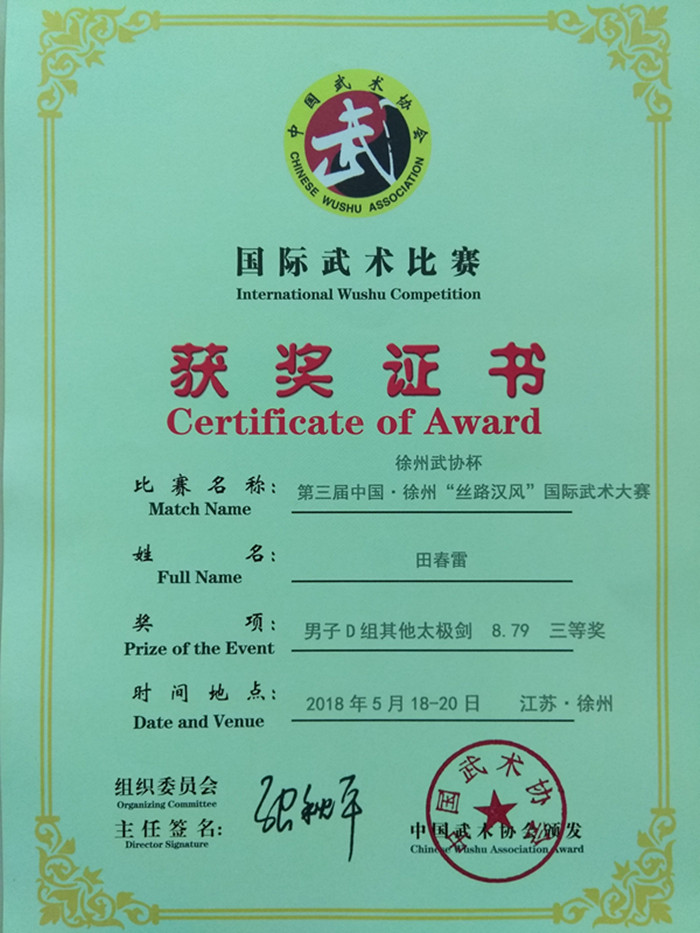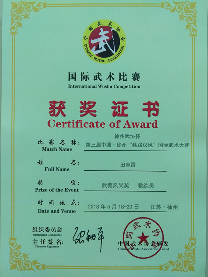 田春雷老师荣获第三届中国(徐州)丝路汉风国际武术大赛奖项