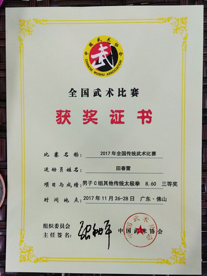 公司田春雷老师荣获2017年全国传统武术比赛三等奖