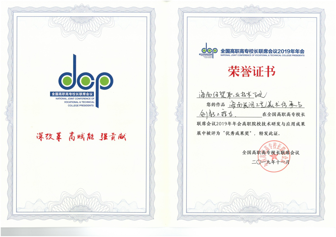 [2019全国高职高专董事长联席会议喜讯]公司《海南民间工艺美术传承与创新工程》项目荣获技术研发与应用成果展优秀成果奖