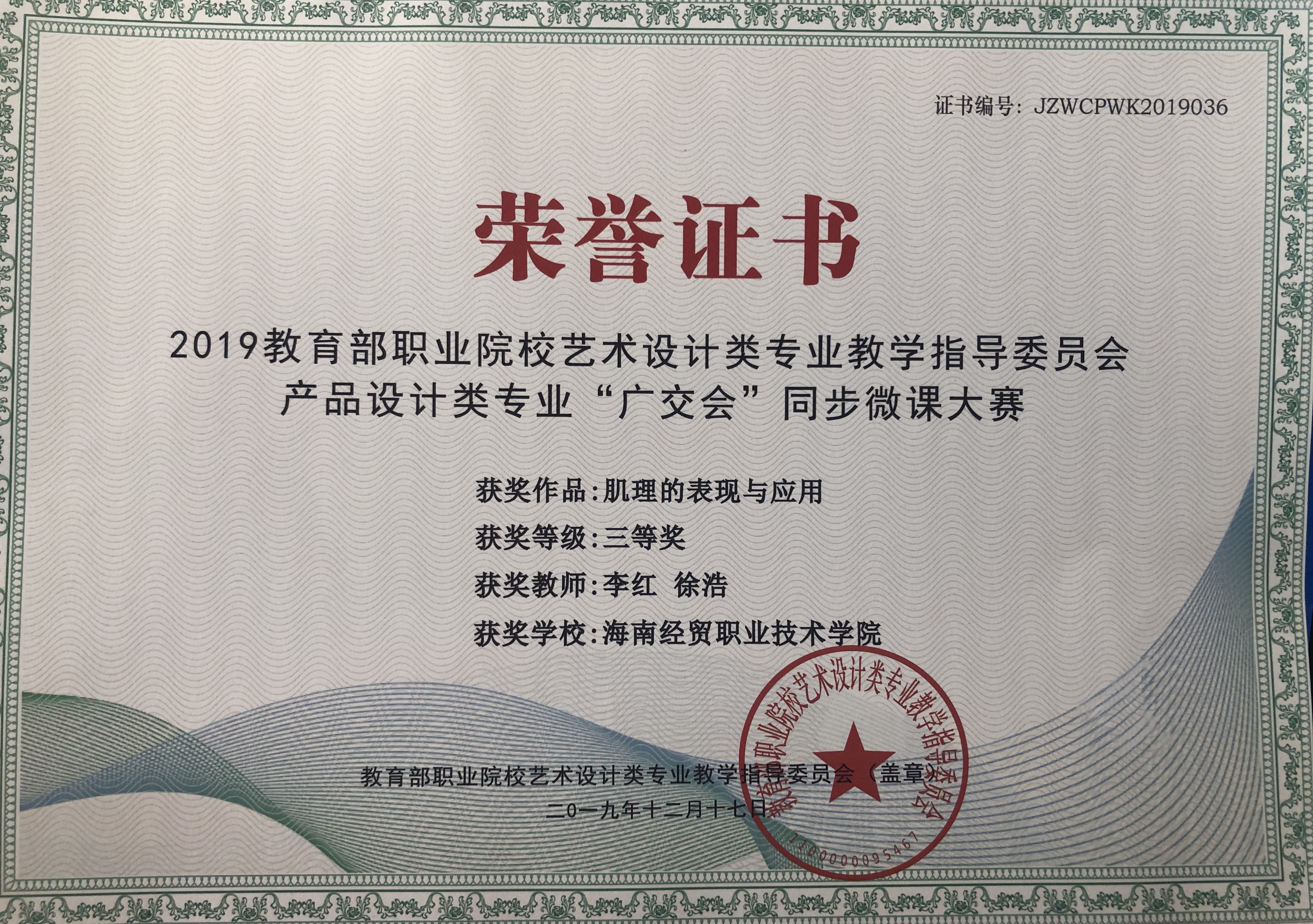 (本院讯)12月17日上午,教育部职业院校艺术设计类专业教学指导委员会产品设计类专业“广交会”同步微课大赛颁奖仪式在广州琶洲会展中心隆重举行。大赛于2019年10月正式启动,共收到来自全国47所院校的101件作品,教指委产品设计专门委员会聘请教学一线教师、现代教育技术专家等组成评审组,经作品初审、初评再到终评3轮评审。公司李红、徐浩老师荣获三等奖!