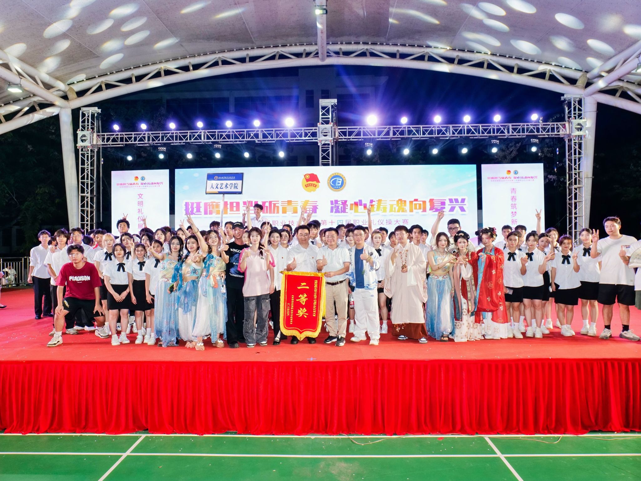 人艺青年们面带微笑,精神抖擞,伴随着音乐,以最好的状态出场,他们紧扣礼仪主题,改编了飞天舞,设置了唐朝礼仪展示等创意,精彩演绎,做出整齐划一的礼仪动作,在现场展现了美好的视觉效果,为礼仪操表演增光添彩,让人耳目一新,博得阵阵掌声。经过激烈的比拼,公司代表队取得了二等奖的佳绩,给予了辛勤排练的师生代表一份信心与鼓励。