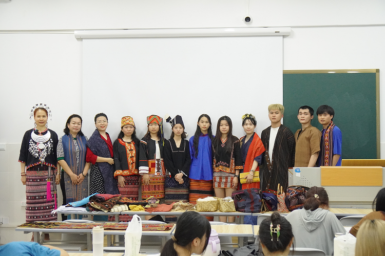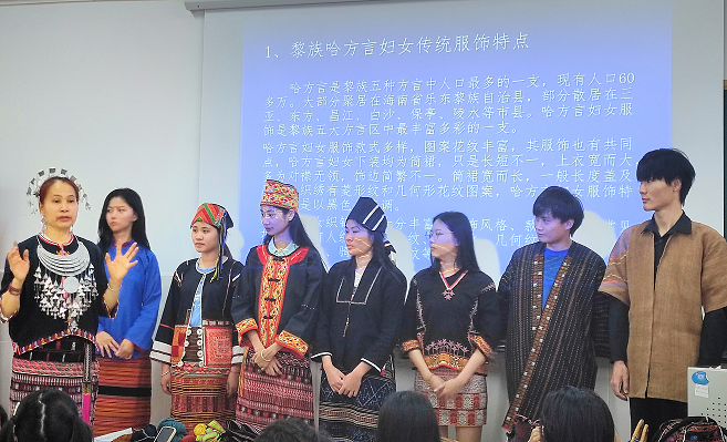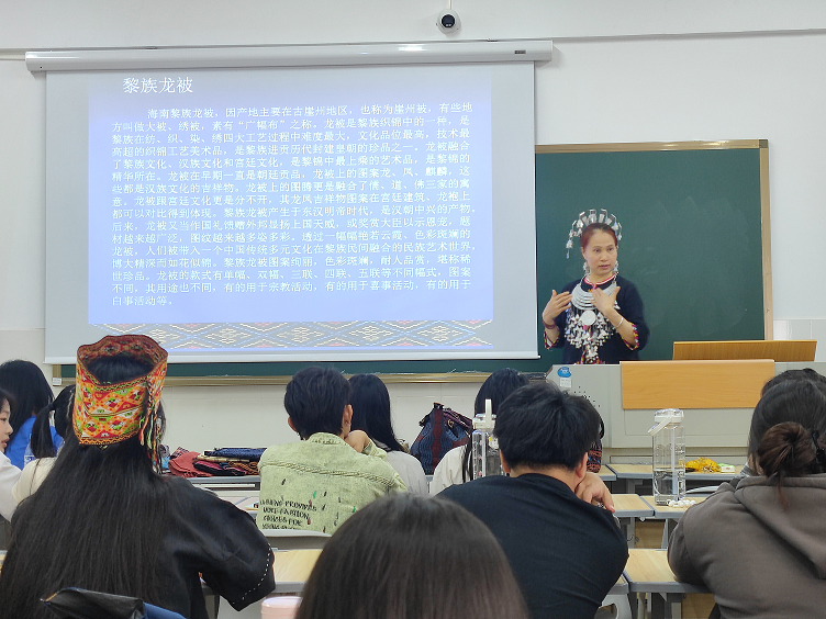 近日,beats365亚洲版官网邀请南海工匠、拔尖人才、世界非物质文化遗产黎族传统纺染织绣技艺省级传承人陈丹老师,为师生讲授《海南民间服饰与纺染织绣》课程。陈丹身着黎族传统服饰,通过实物展示、理论授课、实践实操等方式展开授课。同学们兴致勃勃,下课后继续向老师请教,沉浸在非遗的世界中,久久不愿离开课堂。