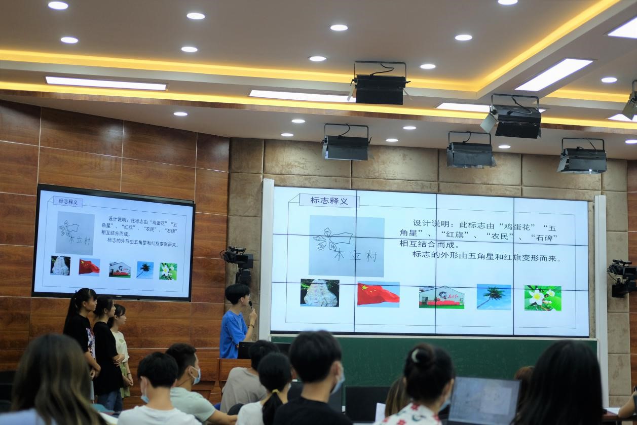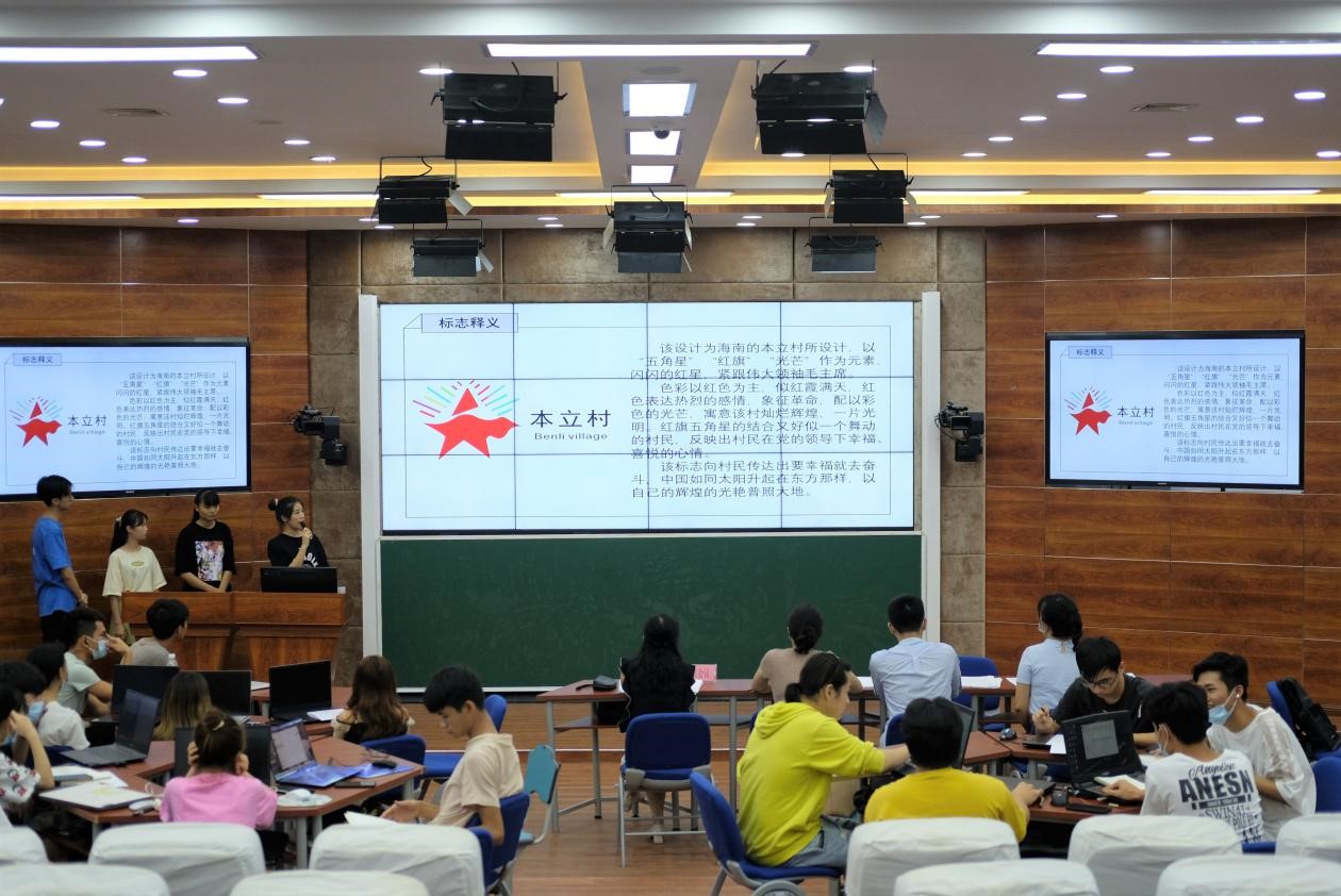 针对公司乡村振兴驻点单位海口市红旗镇“本立村”的需求,授课教师刘首含在前期课程中指导员工分组成7个工作室,组员分别完成标志草图创意,并制作PPT提案在本次课上进行内部竞标。