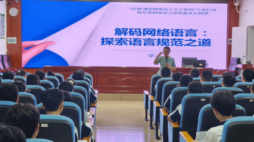 在语言服务现场,实践团以专题讲座为核心载体,为八所中学的同学们带来了一场生动有趣的 “网络语言规范课”。讲座中,成员们通过案例分析、互动问答、经典诵读等形式,深入浅出地讲解了不规范网络语言对学习与沟通的负面影响,网络语言暴力的识别、影响与应对策略,引导同学们正确认识网络语言的“双刃剑”效应。“原来随意使用不规范网络语言,不仅会影响我们的语文成绩,还造成我们和师长沟通障碍,更严重地会成为网络语言暴力的帮凶。” 听完讲座后,八所中学高二(1)班陶建宇恍然大悟。此外,实践团郑重发出倡议 “争做校园好网民,汇聚网络正能量,共建文明自贸港”,通过展板展示、倡议书发放等方式,扩大宣传覆盖面,为青少年筑牢网络语言规范的“防护墙”。